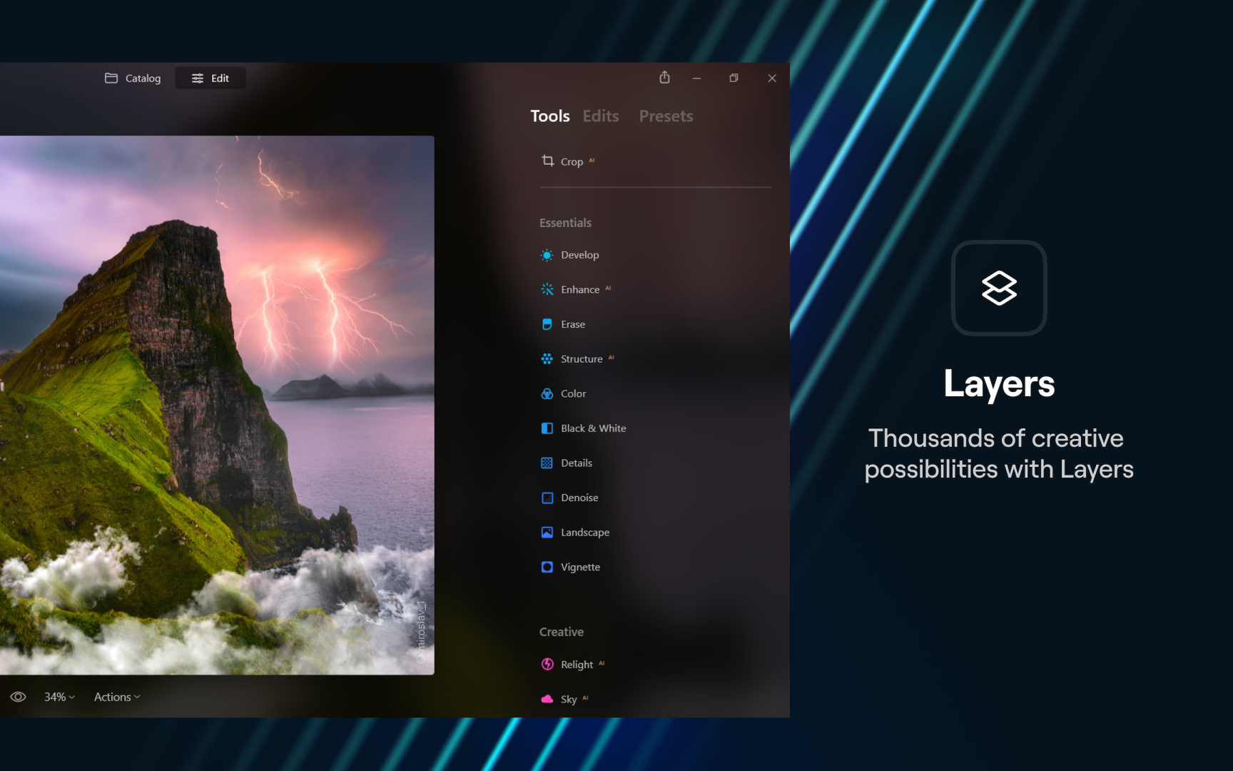 Who says the photo editing process canât be fun? Luminar Neo infuses AI technologies to allow for flexible workflows and high-quality editing, leading to maximum performance and flexibility. This game changer offers an array of AI options such as Skin AI, which automatically detects and corrects skin imperfections. Meanwhile, the tool preserves pores, textures, and hair. With over a hundred powerful editing tools and features, its AI continues to turn heads.
